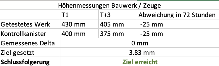 – Messung des Höhenunterschieds zwischen D+0 und D+3 im Kanal und im Kontrollkanister unter Berücksichtigung ihrer jeweiligen Volumina.